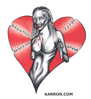 Have a heart girl with a knife zombie doll tattoo design.