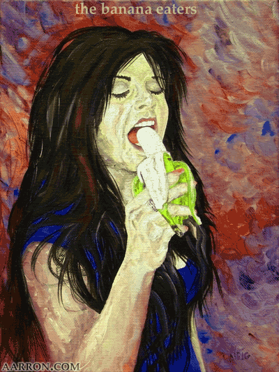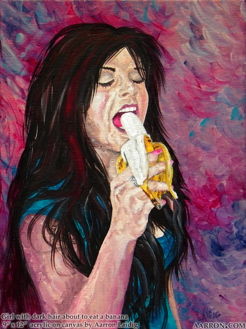 Girl with dark hair about to eat a banana acrylic painting on canvas by Aarron Laidig