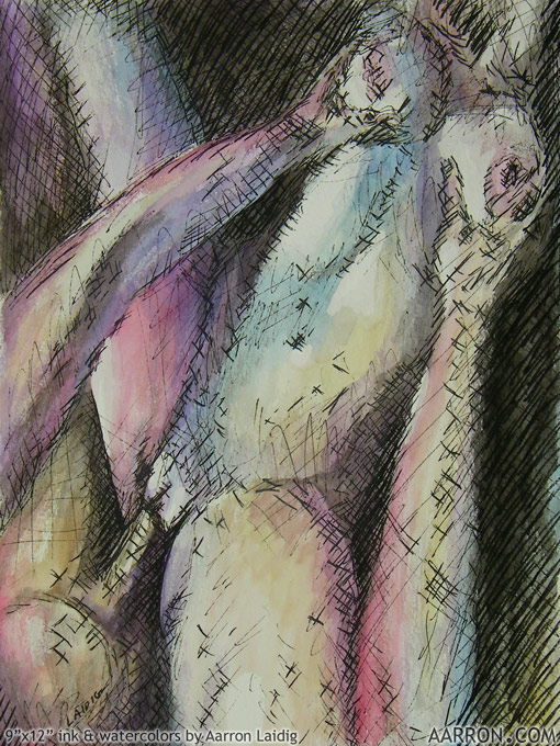 This erotic artwork was done with pigma pens and watercolor washes on coldpress paper measuring 9″ x 12″.