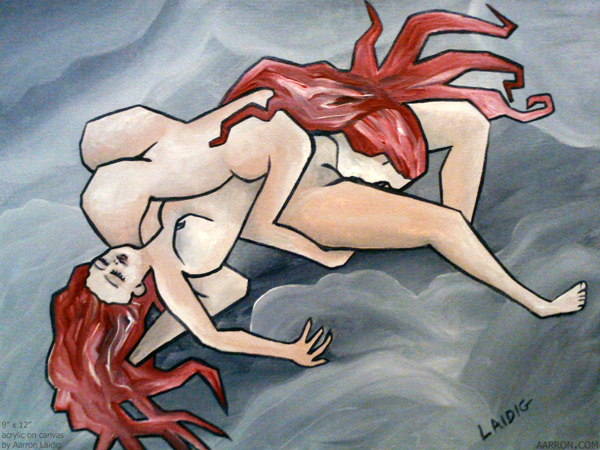 What I was going for here was a dream. The beautiful red haired girl is dreaming of another who is much like her, but also not. I wanted her to be one of her kind, not a mirror image or a self loving fantasy. I was aiming for a dream look as in she is asleep rather than an awake sexual fantasy.
