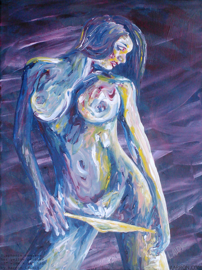 I hope you like or hate Stephanie removes her yellow panties. If you like it I did well by you. If you dislike I did well too. If you have no opinion then I have failed you. Sorry about that. Maybe next time I post I will do you one better and make you say “Wow, that is a splendid work that I would love to have.” Or maybe you will say “Oh my, I can’t stand to even look at that.” As long as it gets you in some way I shall feel I have done my job by you.
