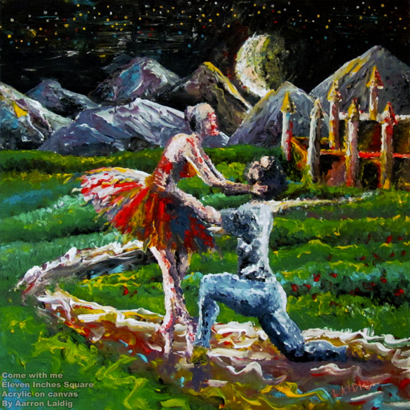 This painting was done with acrylic paints on stretched canvas. The original measures twelve x twelve, but I have cropped it to 11″ x 11″ for prints.