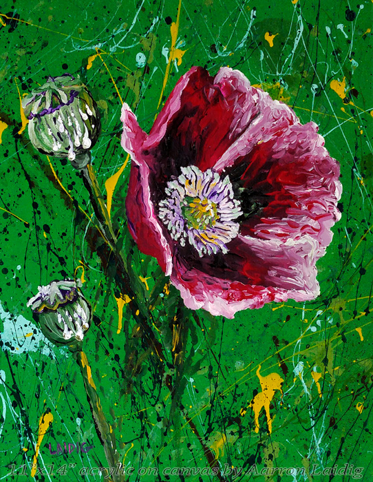 11″ wide x 14 high impression of opium poppies with seed pods and gum.