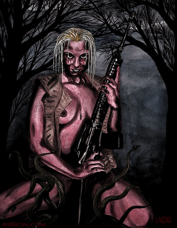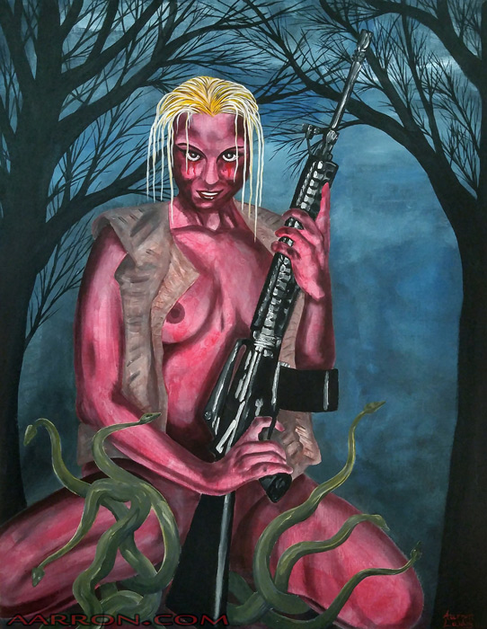 I painted this cruel lady back in 2005 and called her love. Yes, her name is love. It was basically my way of saying that sometimes love can be an evil and murderess creature just waiting to get her hooks into you. I never posted it anyplace before that I recall, but on running into it in my art storage I thought maybe I should. Here she is. Her name is love.