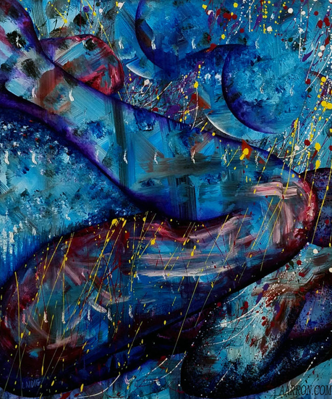 My main thing here is to combine (or attempt to combine) the raw energy and feelings which can be brought forth via abstract expression type artwork and combine it with expressive visual storytelling. My end result has turned out to be a bit of a visual puzzle for some while others get what is happening immediately. A few people can’t see anything in these works I’ve found as well. In this particular one for example many people see nothing beyond a leg or the moons. I’m ok with that, and I hope that the feeling I am pushing is still coming through.