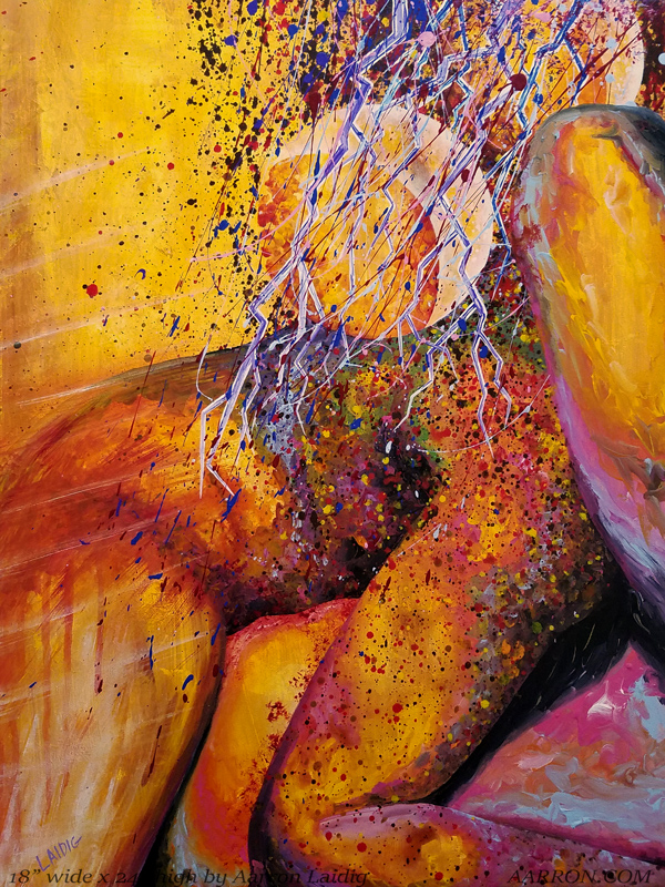 All of the other Two Moons paintings have been done with the feelings and emotional mindset in place while creating them, but this one is a hybrid. It is a blend of what I had been feeling when it started and a bit of something more recent. I had no other way to complete it as I am focusing on feelings rather than thought out ideas with these. That second set of emotions / feelings I worked from was more frenzied, lusty, needy, and zestful. My end result when I looked at the painting initially annoyed me, but after it sat a few days I started to see something cool in it.