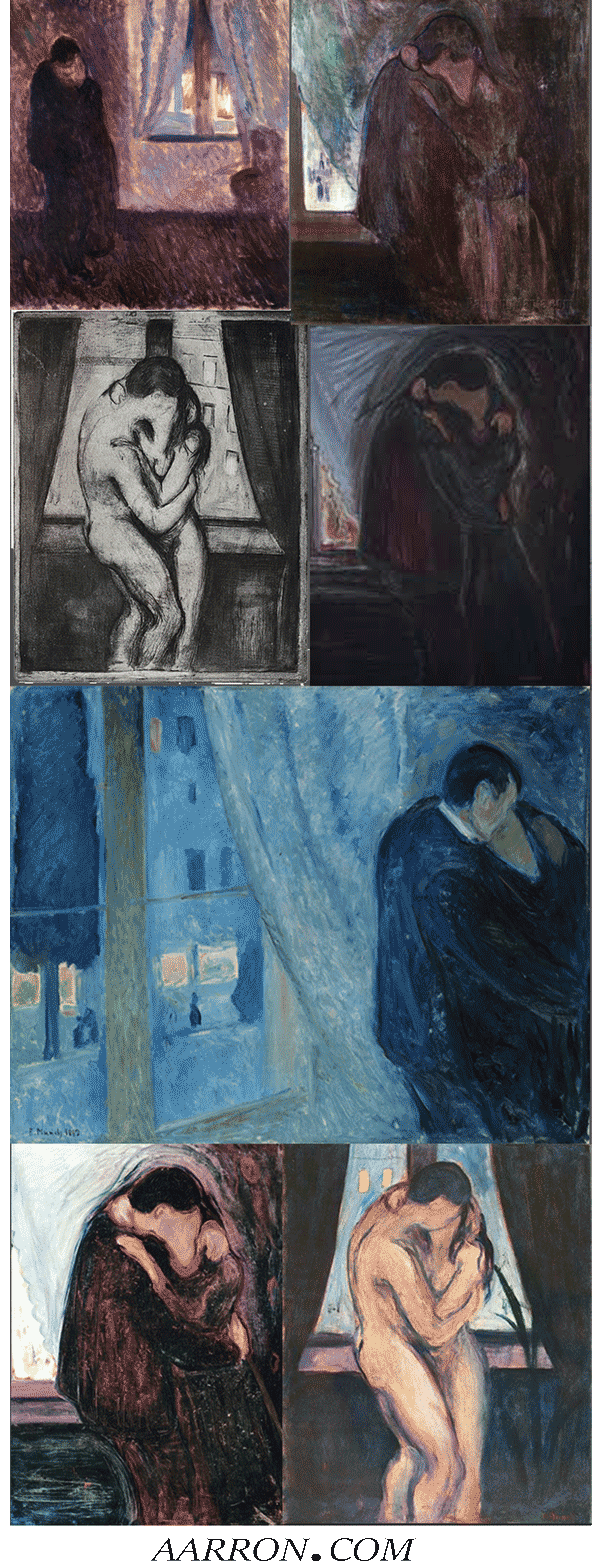 Munch was obsessive. He had things to say. This kiss was revisited many times in pretty much every medium under the sun (and moon) which you can imagine being used for two dimensional art. Besides multiple versions of this imagery he played around with the concept of it and created multiple images of those as well. I will show you just a few, but note that these are just a few of many.