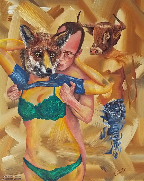 Even though I don’t think it is necessary for the basic explanation of this painting I’m sharing this bit… The angle, coloration, shape, and exaggerated size of the forehead was done to symbolize and bring to mind a phallus in it’s most excited state. These are little gems I hide throughout all my work. Not phallic symbolism and such, but little extras that have or add meaning to a piece when studied. It was not necessary to share that one in this case however so I hope Mrs swollen pink forehead noticer is happy I mentioned it here.