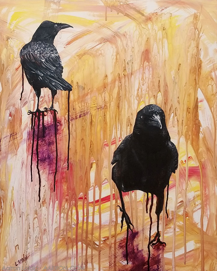 This painting was partly inspired by those crows and ravens I feed and partly inspired by the Norse mythology of Huginn and Muninn.