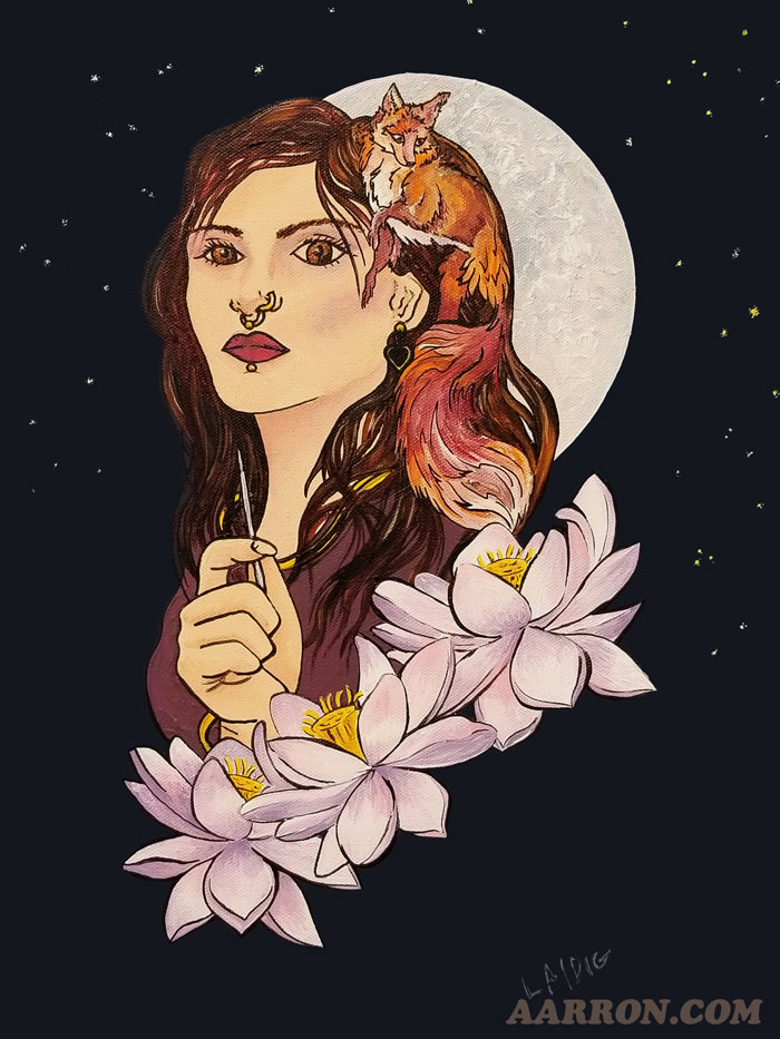 I know… not very Aarron-like. I’m full of ideas and if referencing images at all they are almost always my own. Eventually settled on a few to look at. Moon stuff, tattoo stuff, a fox that was drawn sweet… I quickly sketched it out on a small canvas and then took it to my painting room. Goodbye references. That turned out a mistake because later I went to look again and realized I’d not saved images, just looked online during the sketch and then closed windows. Oh well… better left to the fates. Too much referencing makes for lazy art and similar imagery. This way it took a life of its own. My goal was kinda tattooish, kinda painterly, and a bit mystical with a piercer focus.