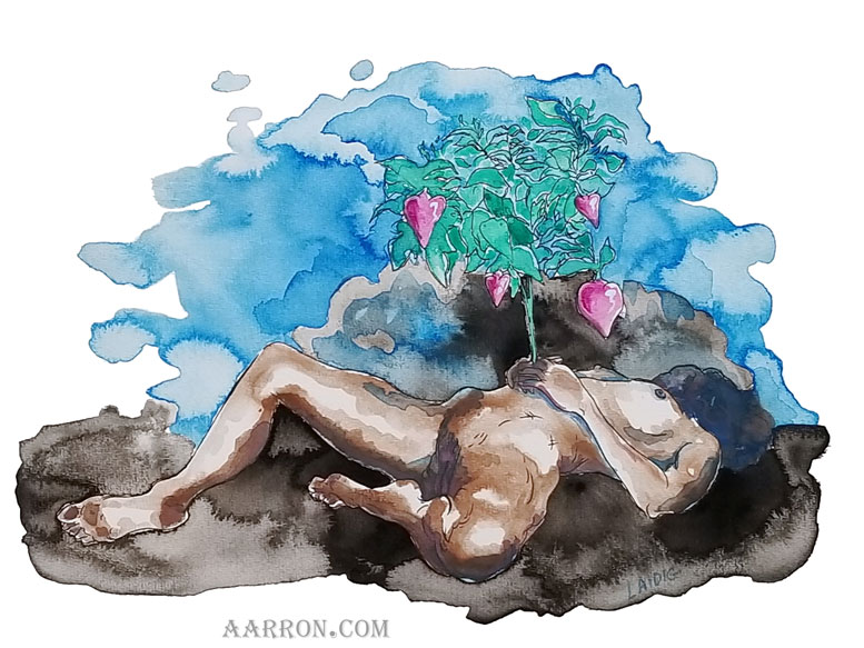 Anyways… this was a quick ink sketch on a 9″ high X 12″ wide piece of thick-ish paper that I decided to treat to a bit of acrylic paint and a tad of watercolor. It ended up mostly acrylic paint with very little ink or watercolor showing.